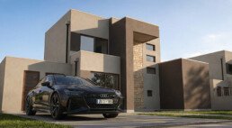 Volumetría contemporánea con revestimiento de piedra natural, estucos texturados en tonos tierra y planchas de hormigón. Composición de planos y voladizos que definen una arquitectura de carácter y alto valor en el tiempo.
